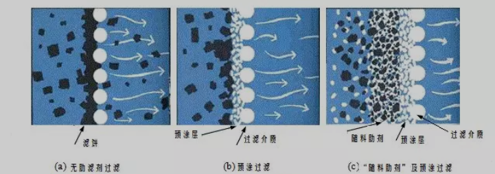 首先,将助滤剂与洁净滤浆混合均匀后,通过循环过滤使助滤剂在过滤介质上形成多孔、疏松的滤饼,称为“预涂”。预涂可以有效防止杂质阻塞过滤介质孔隙,延长过滤周期和使用寿命,可以提高过滤精度。主要的一个特点是便于卸除滤饼和清洗过滤介质。